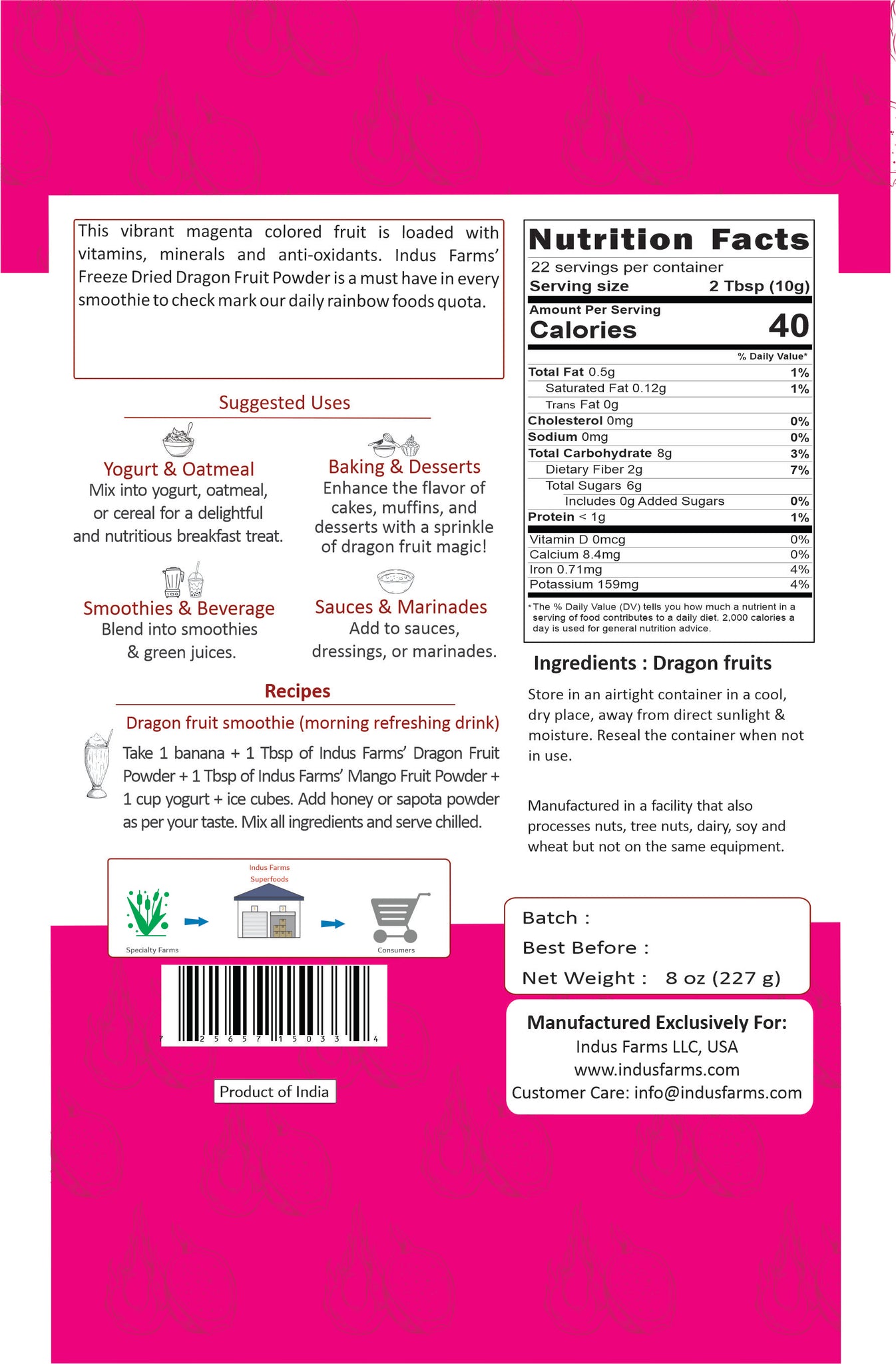 Indus Farms Superfoods | Freeze Dried Dragon Fruit Powder (Pitaya) | Vibrant Pink Superfood | Rich in Fiber & Antioxidants | Perfect for Smoothies, Baking & Bowls | Non-GMO, Vegan
