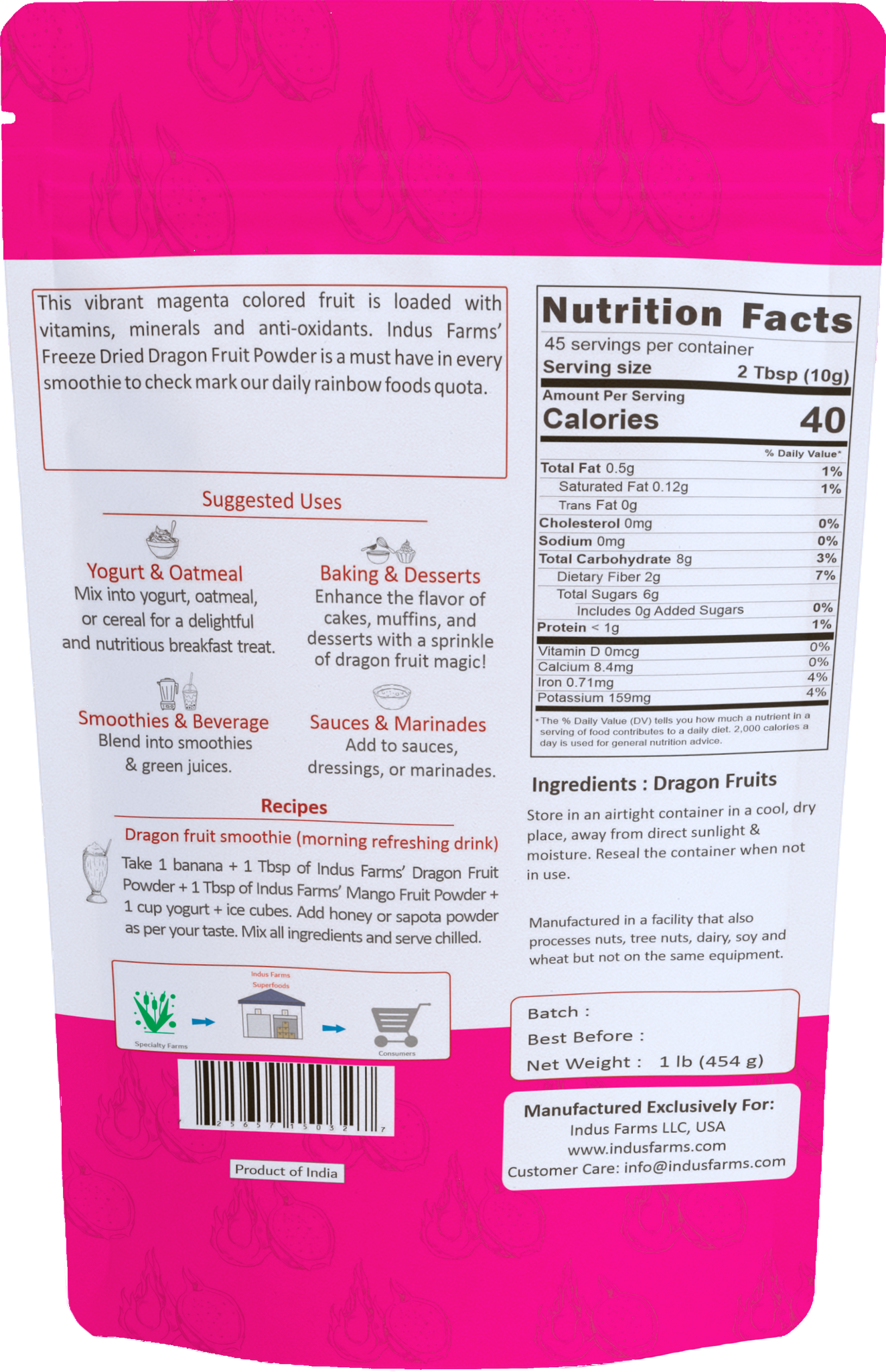 Indus Farms Superfoods | Freeze Dried Dragon Fruit Powder (Pitaya) | Vibrant Pink Superfood | Rich in Fiber & Antioxidants | Perfect for Smoothies, Baking & Bowls | Non-GMO, Vegan