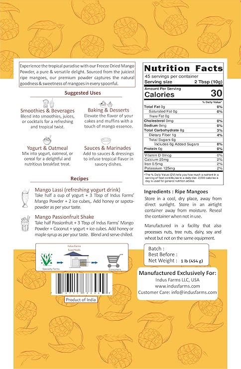 Indus Farms Superfoods Freeze Dried Mango Fruit Powder, 100% Pure, Additive-Free, GMO-Free, Vegan